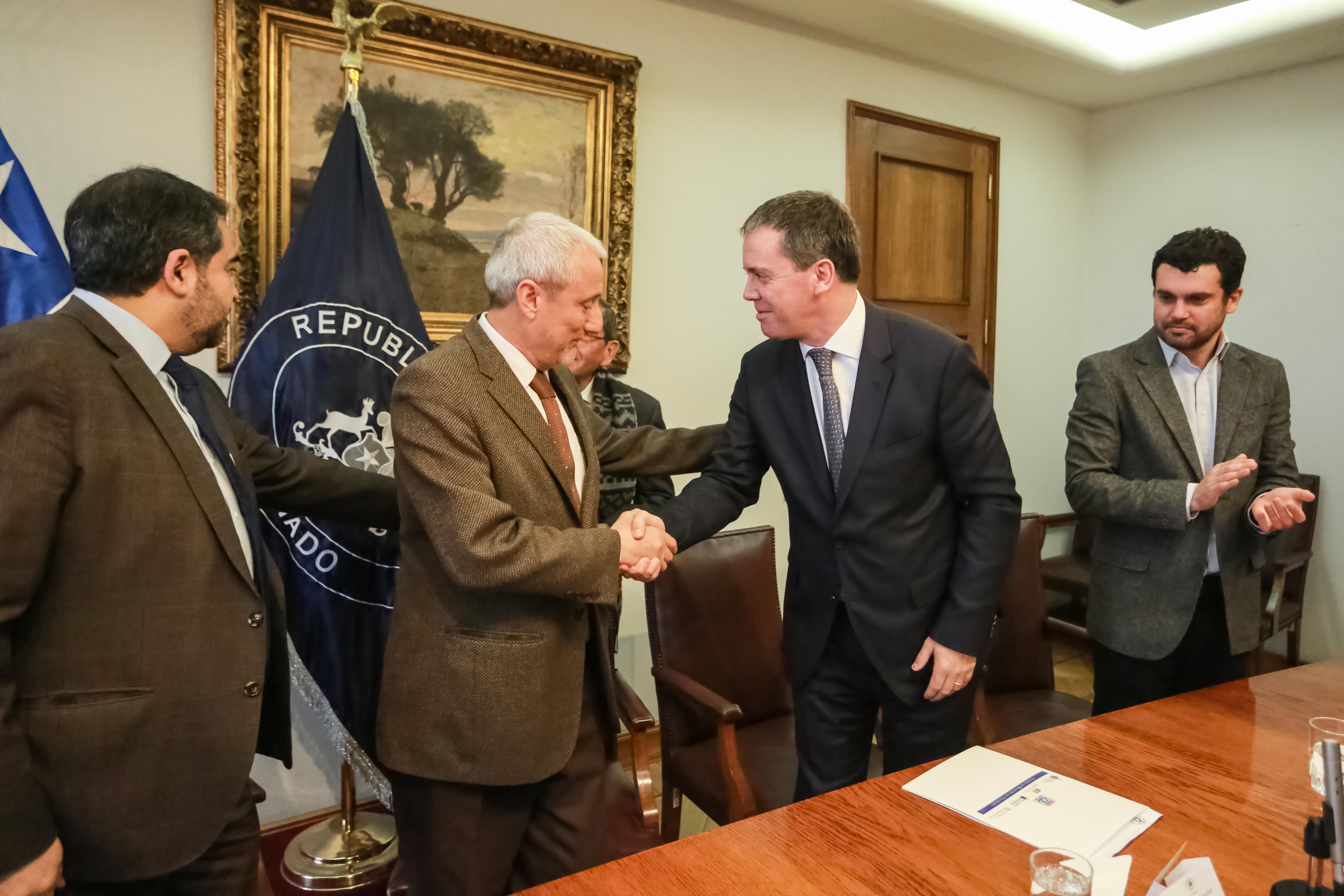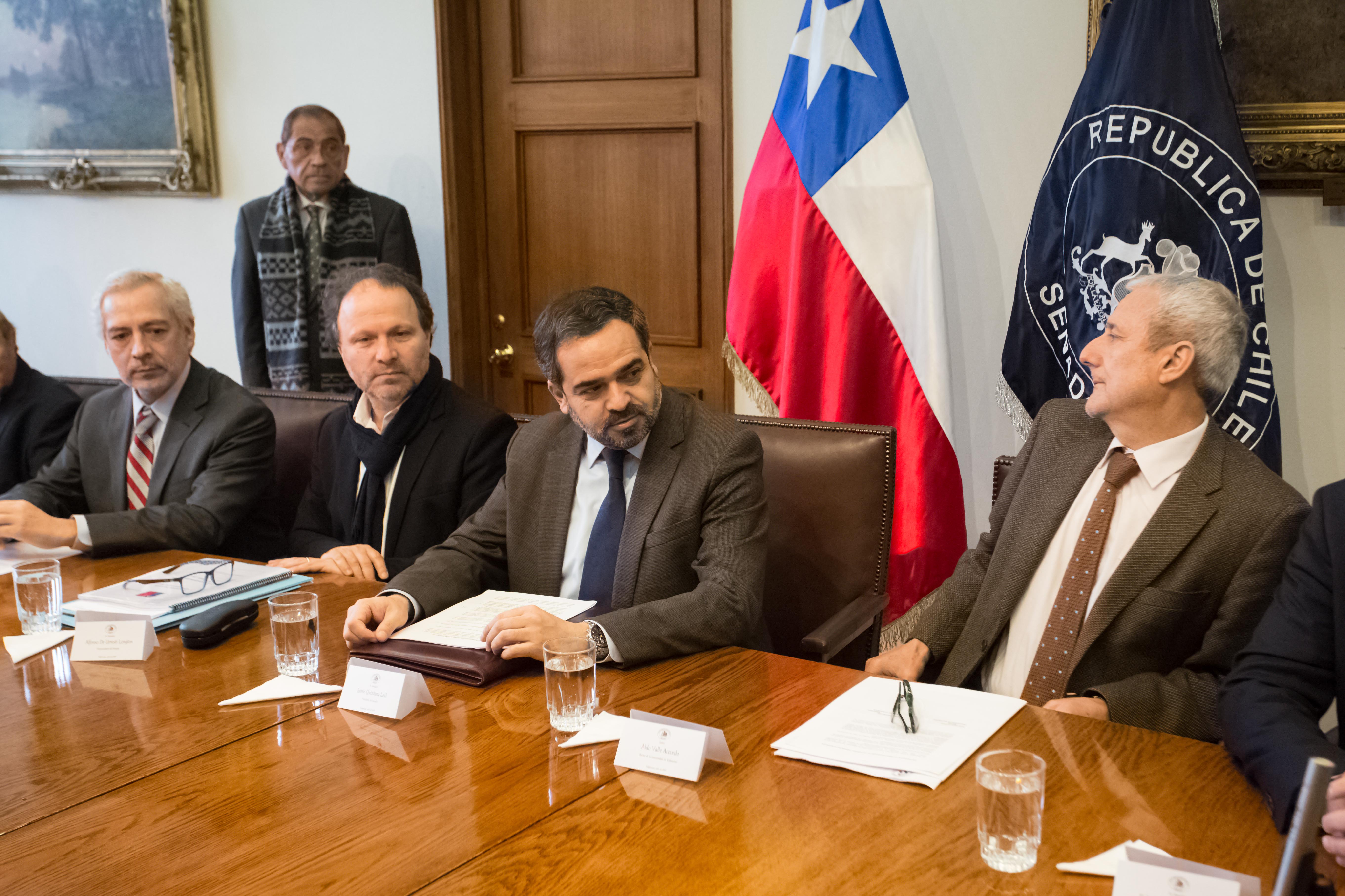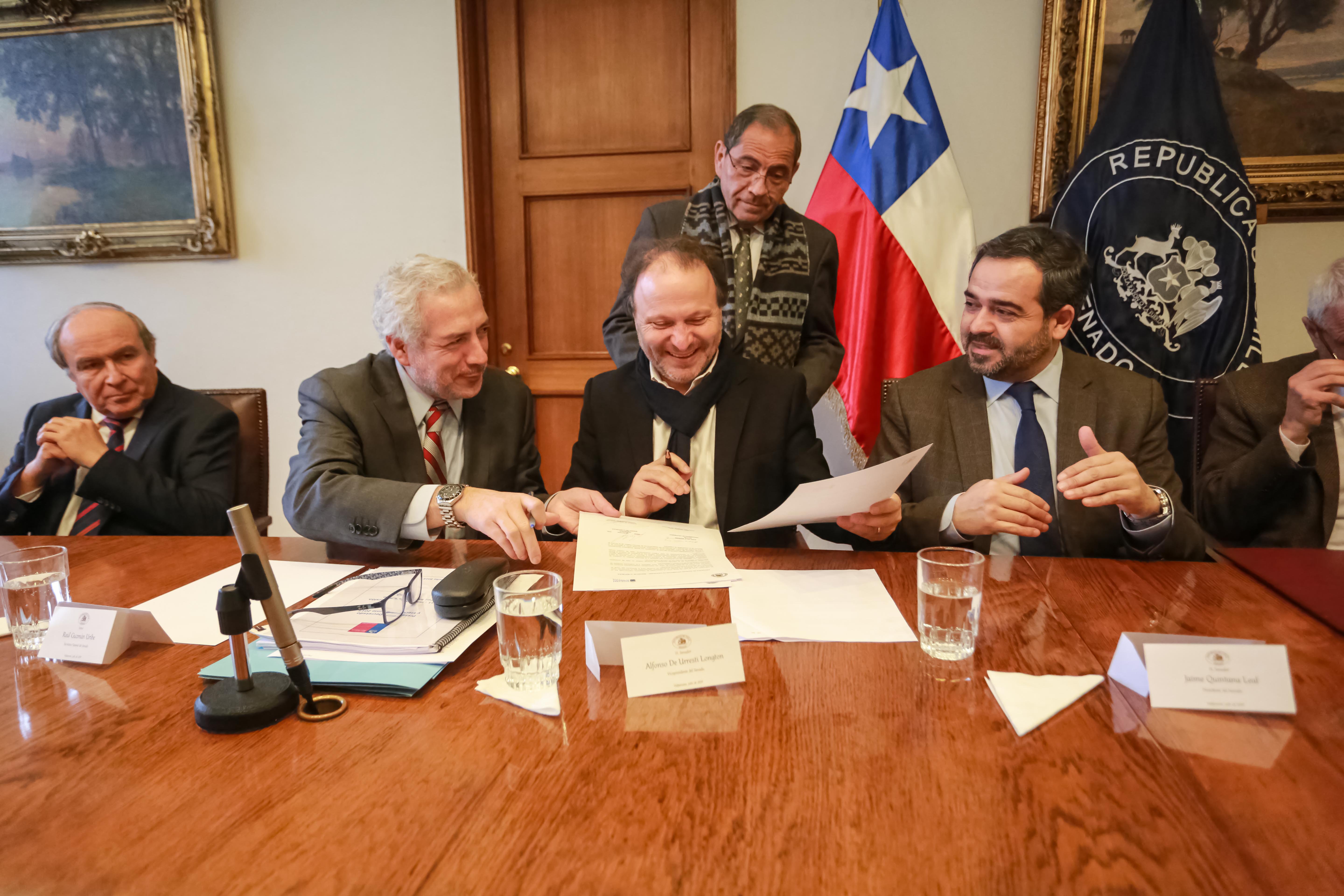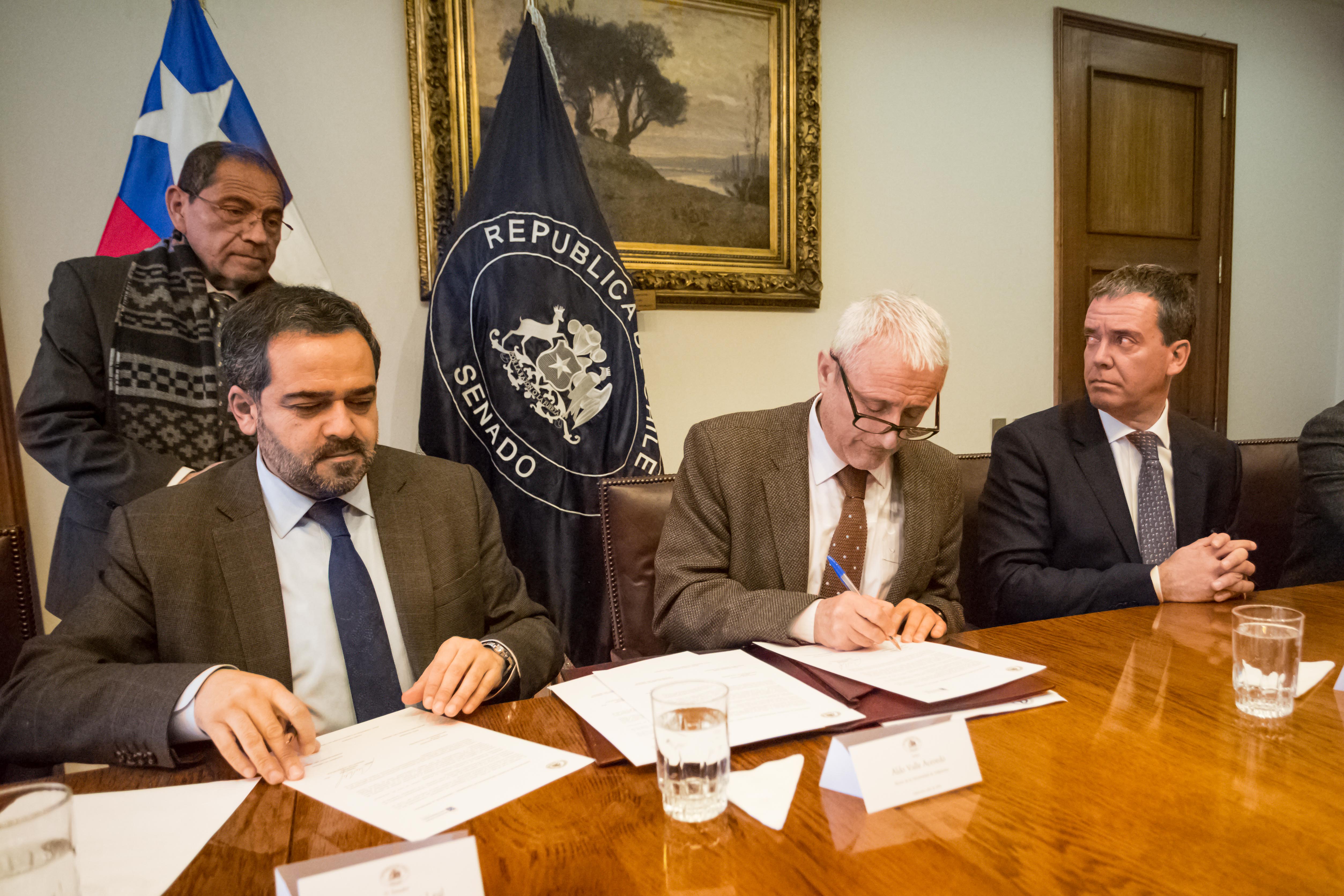 Firmaron el convenio el rector de la Universidad de Valparaíso, Aldo Valle; el presidente del Senado, Jaime Quintana; el vicepresidente del Senado, Alfonso de Urresti; el secretario general del Senado, Raúl Guzmán; y el presidente de la comisión Constitución, Legislación, Justicia y Reglamento del Senado, Felipe Harboe.
