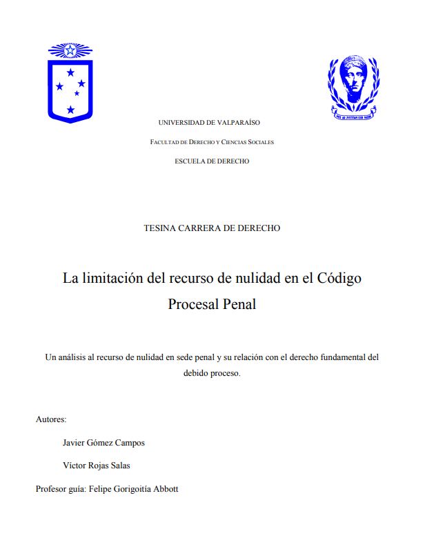 | dc.identifier.citation | Gómez Campos, J., Rojas Salas, V. (2013). La limitación del recurso de nulidad en el Código Procesal Penal. Un análisis al recurso de nulidad en sede penal y su relación con el derecho fundamental del debido proceso. [Tesis de pregrado, Universidad de Valparaíso]. | en_ES |