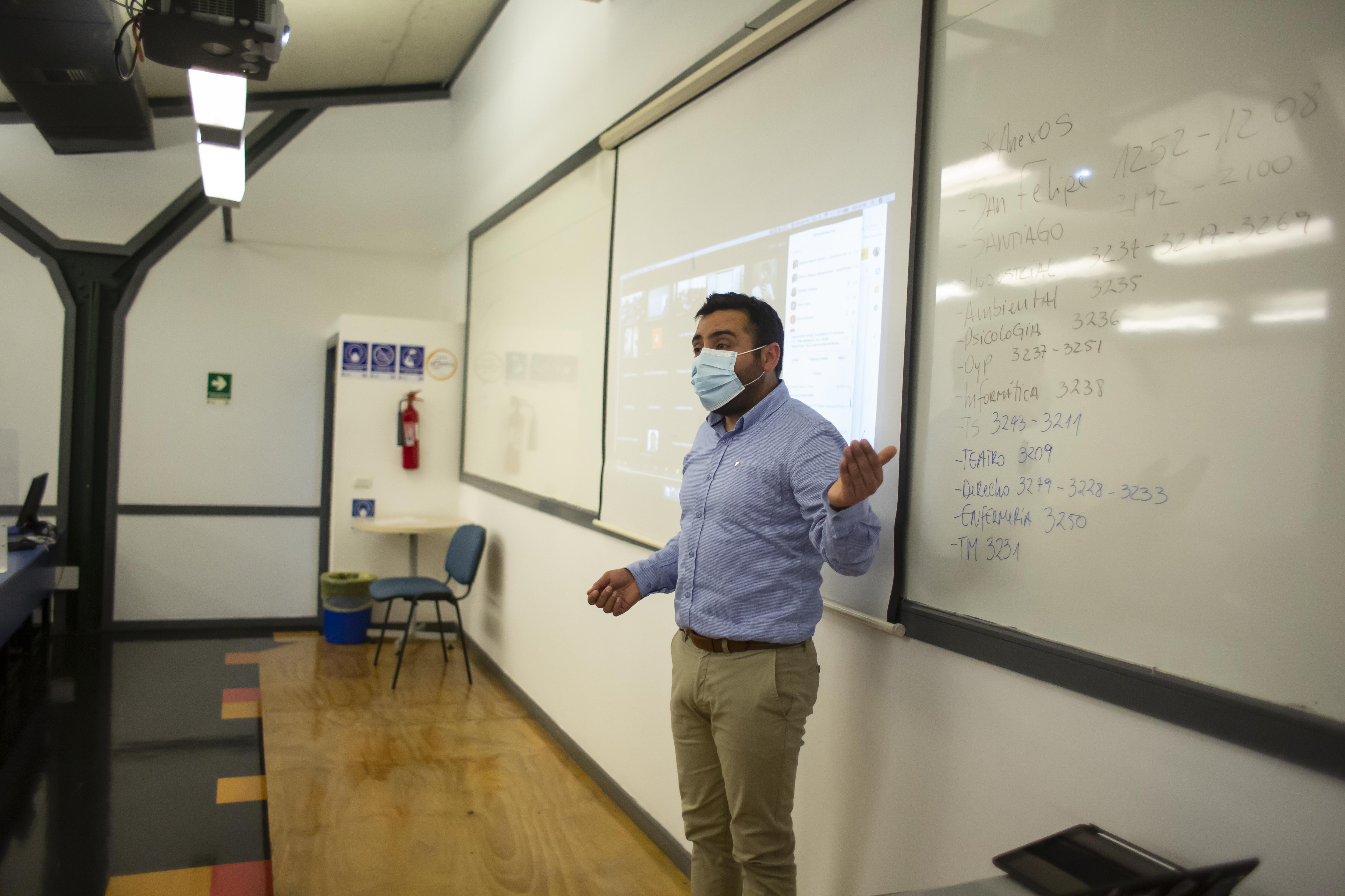 La Escuela de Ingeniería en Informática fue la primera que comenzó con el sistema híbrido, con la asignatura de Fundamentos de Programación, a cargo del director de la Escuela, Roberto Muñoz, y del profesor Rodrigo Olivares, quienes en dos salas recibieron cerca de 16 de estudiantes cada uno.